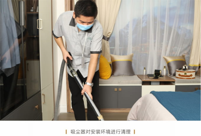 产品安装确认无误后及时清理房间内因安装产生的垃圾并保持空气流畅,然后用干净的抹布将米兰擦拭一遍,确保产品清洁,用吸尘器对安装环境进行清理,并对所有安装好的产品拍摄记录作为完工效果备案。