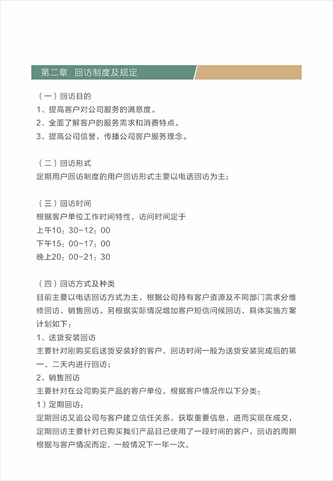 1、导购、店面、售后人员接到维修等售后问题来电时,第一时间先安抚好客户情绪,认真倾听客户的问题描述,并尽量问清存在的问题和故障现象,应详细记录顾客名字、联系电话、地址、商品型号、问题等信息,将这些信息登记于《售后服务跟踪单》上后,再次确认客户问题及诉求,看是否有遗漏,确认无误后回复客户多长时间给他答复;