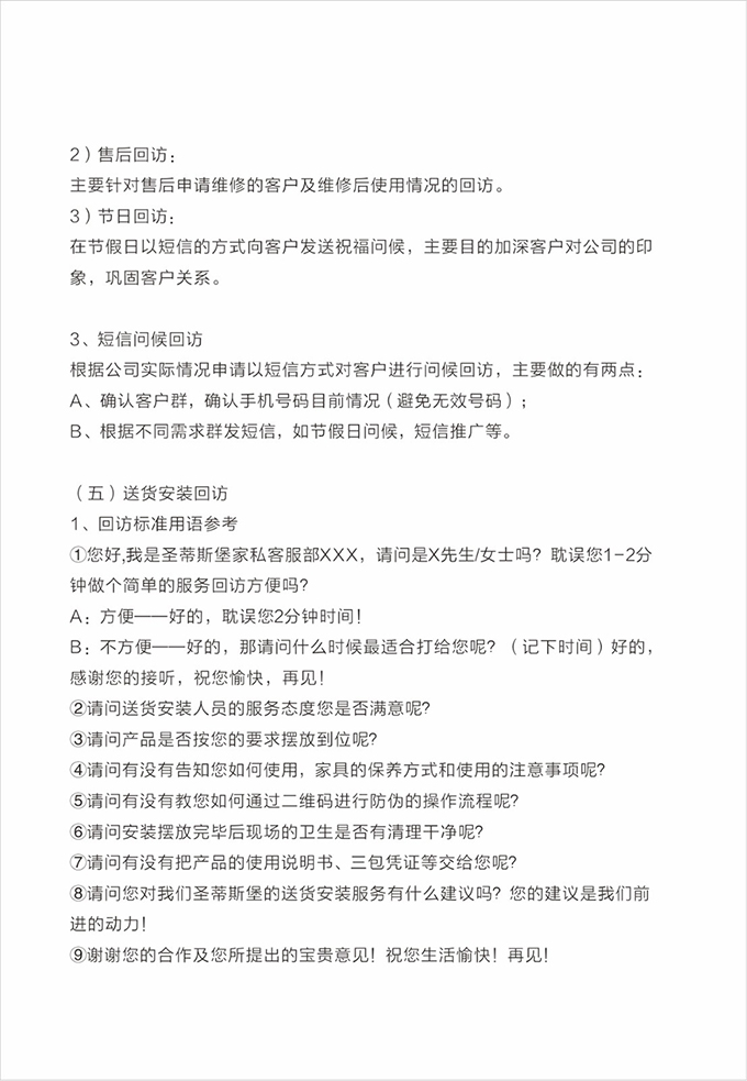 话术参考:“**先生/女士您好,我是米兰体育的售后服务人员**,您购买的米兰体育米兰已经全部到货了,送货安装大约需要**时间,请问您这边什么时候方便我们上门送货安装呢?”同时要了解送货小区的电梯、楼道、入户门的尺寸等,提前做好准备,避免意外情况。最后确定送货时间(安装所需要时长),并告知客户安装人员的相关信息,可加微信发送,并发送配送安装流程说明。